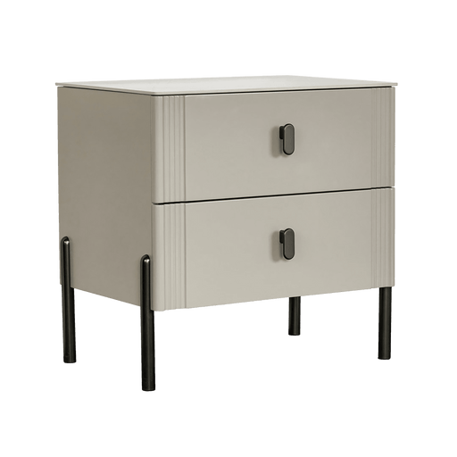 OC HomeCompact bedside table in greige finish. Provides storage and surface for essentials. Blends with modern bedrooms.