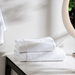 White bath sheet with plush texture. Absorbs water quickly after baths. Durable and soft cotton fabric.