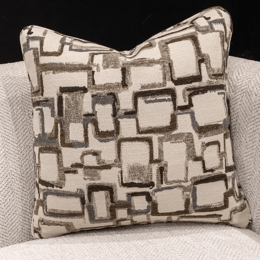 Living PointThis elegant throw pillow features a modern abstract pattern of overlapping rectangles in warm tones of brown, taupe, and muted blue on a neutral b...