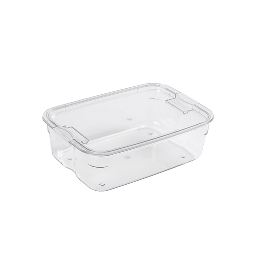 OC HomeClear bin with protective lid to keep items fresh. Durable PET construction with space-saving design. Not suitable for dishwasher or microwave use.