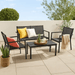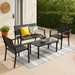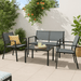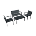The Rimonaa Outdoor Sofa Set in black, crafted from solid wood and metal, provides durable and comfortable seating. This weatherproof set, including a 2-seater, two single sofas, and a coffee table, is designed for stable outdoor use and is easy to clean.
