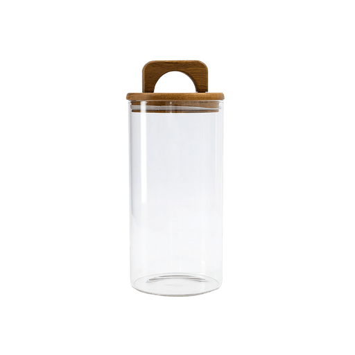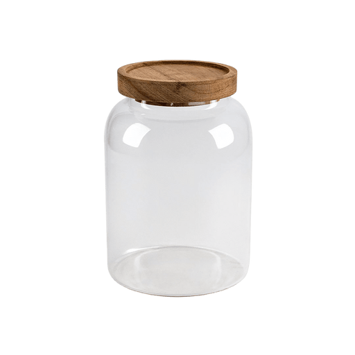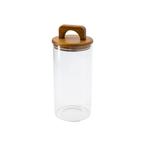 OC HomeGlass canister with acacia wood lid. Ideal for storing dry foods. Durable and airtight seal.