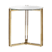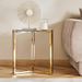 The Willa End Table in gold boasts a stylish hexagon shape, crafted from durable stainless steel with a sleek glass tabletop. This sturdy piece offers a modern design with a metal essence, adding a touch of elegance to your living space.